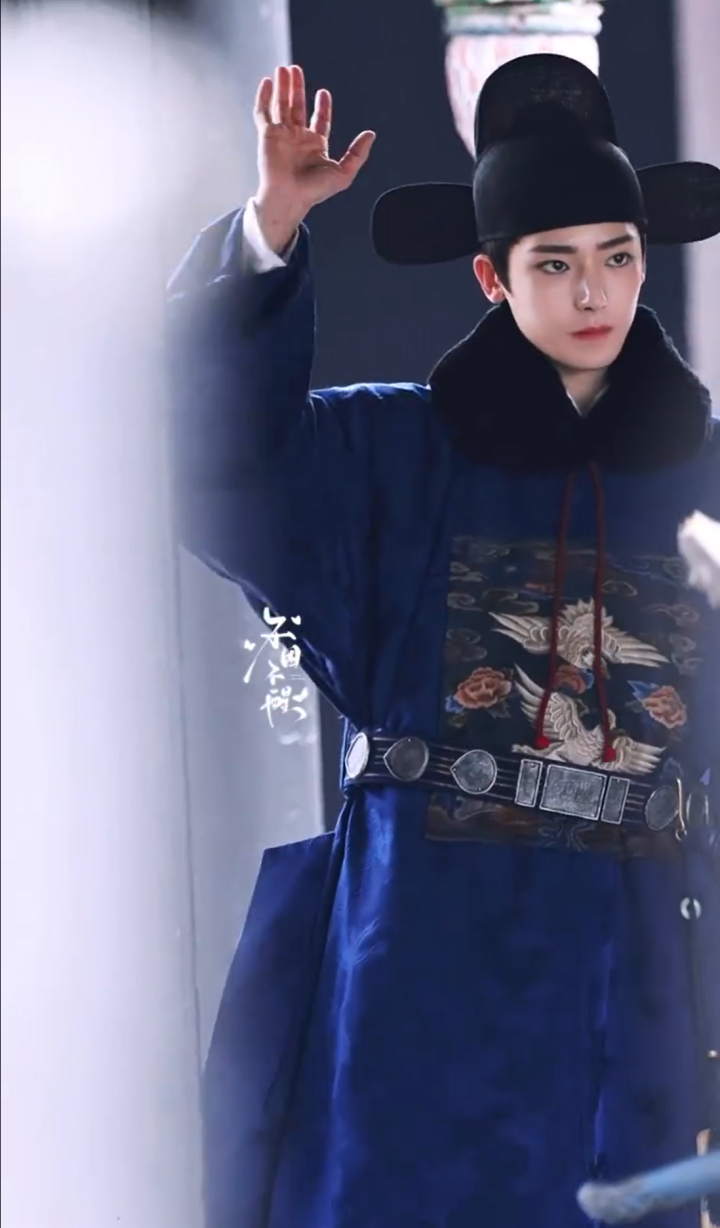 男主侯明昊饰演的陆江来,一袭蓝衣官服,服装精致的纹理配大毛领,贵气逼人,眼神锐利坚定,有状元郎的自信从容。